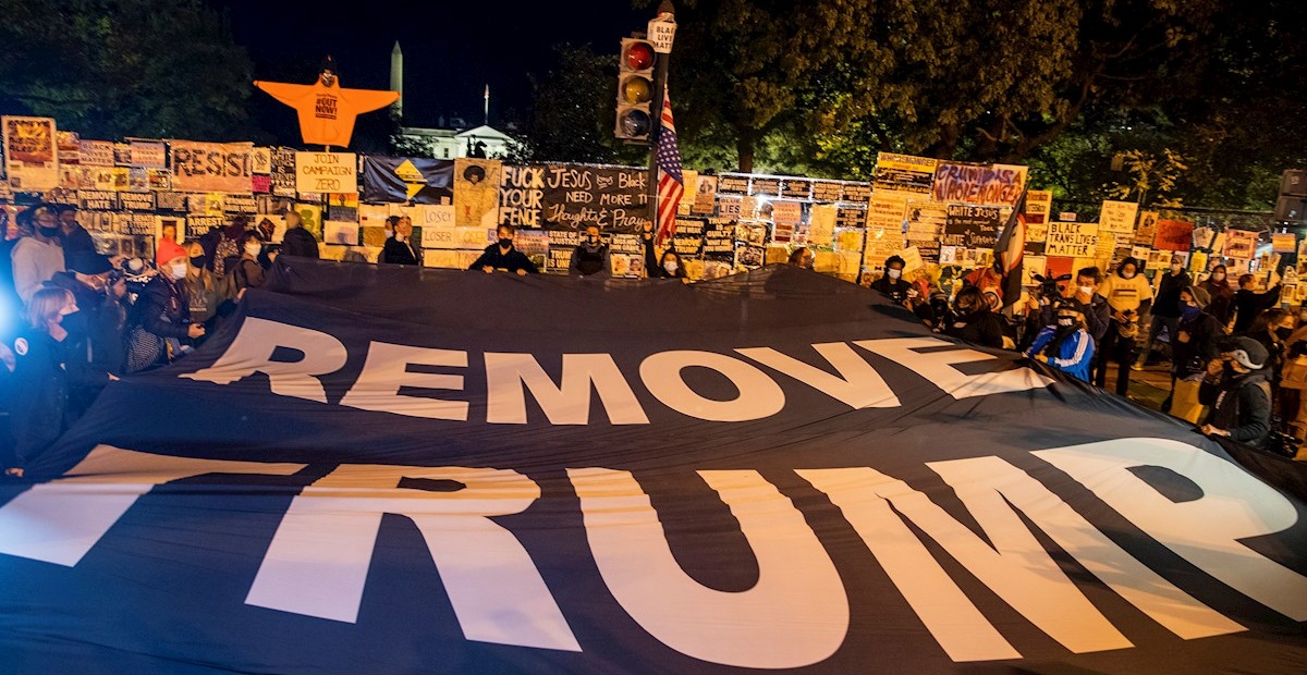 Entre música y pancartas, un centenar de personas se manifestaron este martes frente a la Casa Blanca para exigir el fin de la brutalidad policial contra los afroamericanos y celebrar el que esperan sea el final de Donald Trump en la Presidencia de Estados Unidos.