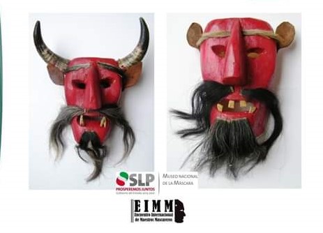 En esta ocasión se presentan dos máscaras ceremoniales de Semana Santa que representan al diablo, realizadas en madera, color rojo, con cuernos de res; cejas, bigote y barba de cerdas naturales, dientes de madera y orejas de cuero, elaboradas por el maestro mascarero Crescenciano Granizo Maldonado, quién es originario de la comunidad de San José, en el municipio de Ciudad del Maíz, en el estado de San Luis Potosí.