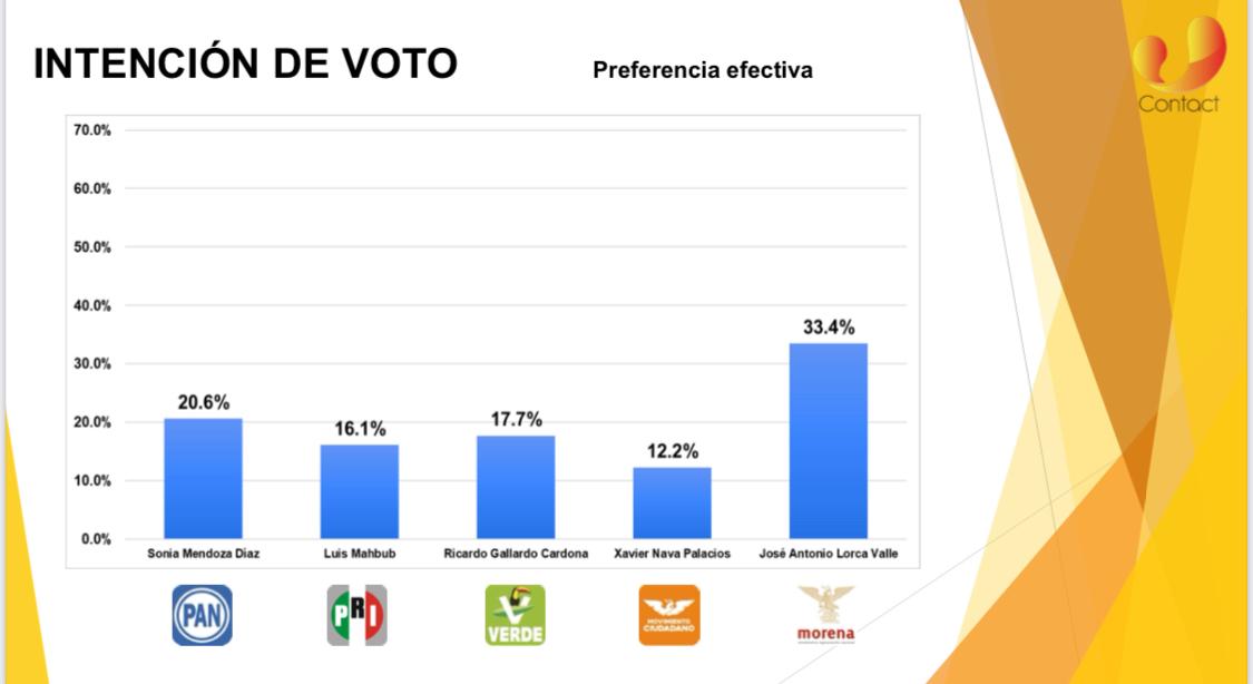 En el rubro de la intención del voto, si los candidatos fueran los siguientes: Sonia Mendoza por el PAN; Luis Mahbub por el PRI; Ricardo Gallardo por el PVEM; Xavier Nava Palacios por MC y José Antonio Lorca Valle (MORENA):