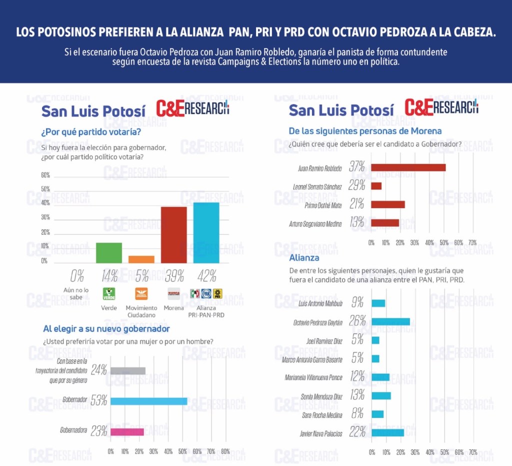 El precandidato del PAN a la gubernatura, Octavio Pedroza Gaitán encabeza encuesta entre las preferencias ciudadanas para encabezar la coalición “Sí por San Luis” que conforman los partidos PAN, PRI, PRD y Partido Conciencia Popular para las próximas elecciones del 6 de junio de 2021.