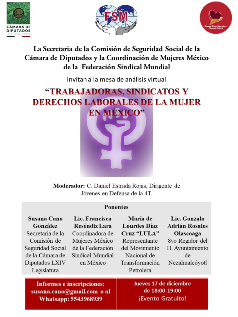 Quién como representante de la Coordinación de Mujeres México de la Federación Mundial Sindical, y con experiencia en temas sindicales, dictará su ponencia sobre la situación de la mujer, ante la nueva reforma laboral y sus repercusiones en el país, en el escenario del nuevo acuerdo comercial entre México, Canadá y Estados Unidos, T-MEC, evento nacional que se realizará el próximo 17 de diciembre en una plataforma virtual.