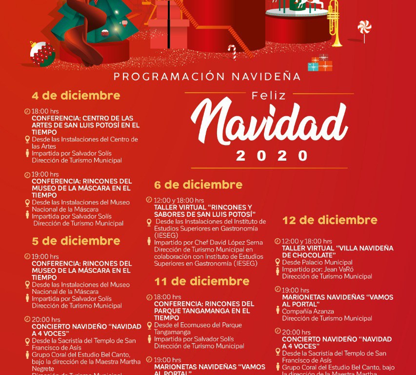 Las actividades serás transmitidas durante todos los fines de semana de diciembre de 2020, así como en algunos días de enero de 2021, a través de la plataforma de Facebook (@TurismoMunicipalSLP)