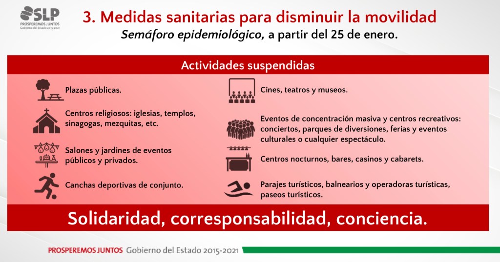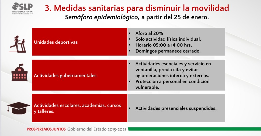 La mañana de este viernes 22 de enero del 2021, el Gobernador Juan Manuel Carreras anunció que el estado potosino regresaba al estado de alerta máxima por el COVID-19.