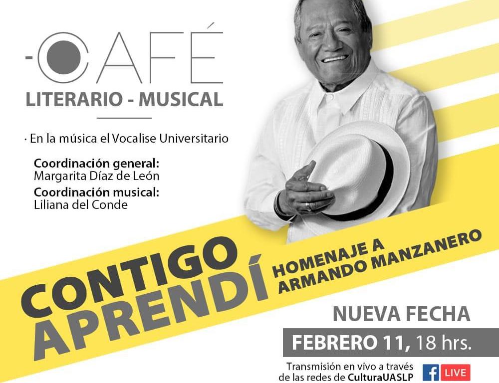 La Universidad Autónoma de San Luis Potosí (UASLP), a través de la División de Difusión Cultural (DDC), dio a conocer que como parte de su compromiso con el cuidado de la salud de todos, que El Café Literario Musical «Contigo Aprendí», homenaje a Armando Manzanero, cambio de fecha, al 11 de febrero de 2021, en punto de las 18:00 horas, evento que será transmitido a través del Facebook Live Cultura UASLP.
