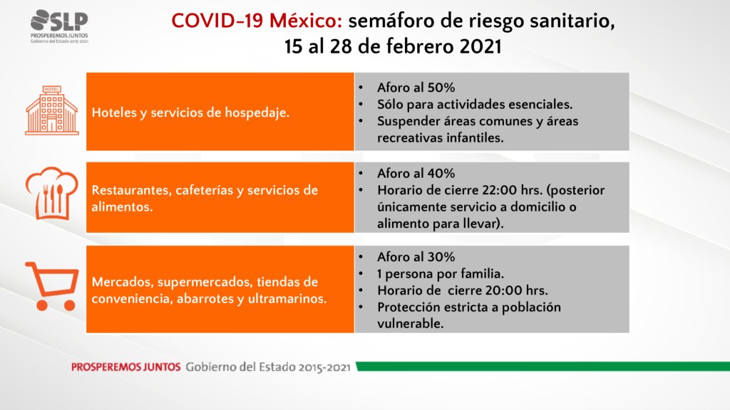 Entre las restricciones destacadas se encuentran los mercados, supermercados, tiendas de conveniencia y abarrotes tendrán un aforo al 30% y se extenderá el horario de cierre a las 20:00 horas. También los restaurantes, cafeterías y servicios de alimentos deberán tener un aforo al 40% y también tendrán una extensión al horario de cierre, el cual, será ahora a las 22 horas y posteriormente únicamente servicio a domicilio o para llevar.