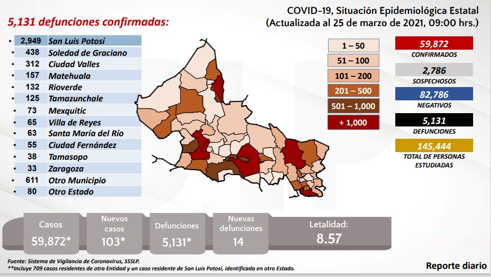 porcentaje de 8.57 de letalidad, así como 103 nuevos casos, que representan 59 mil 872