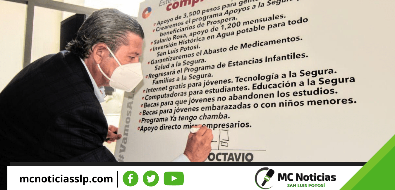 Durante rueda de prensa, efectuada este martes, el candidato de la Coalición «Sí por San Luis Potosí» (PAN-PRI-PRD-PCP), Octavio Pedroza Gaitán, firmó 13 compromisos en materia de desarrollo social, entre los que se encuentran implementar el programa «Apoyos a la Segura», que sustituirá al desaparecido programa federal «Prospera» y otorgar becas a jóvenes y a adolescentes embarazadas, todo ello vigilado por un consejo ciudadano que garantizará que los programas sociales no se utilicen con fines electorales y cero corrupción.