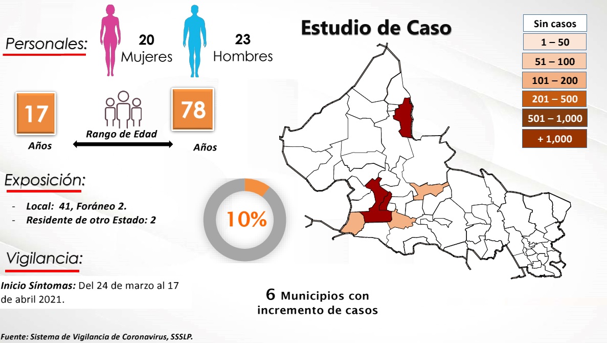 - Se reportan 43 nuevos casos y 6 defunciones en la entidad potosina. Letalidad se ubica en 8.66 decesos por cada 100 pacientes.