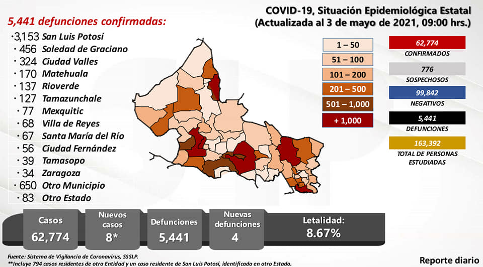 - Ocho nuevos casos y cuatro defunciones este 4 de mayo en SLP.