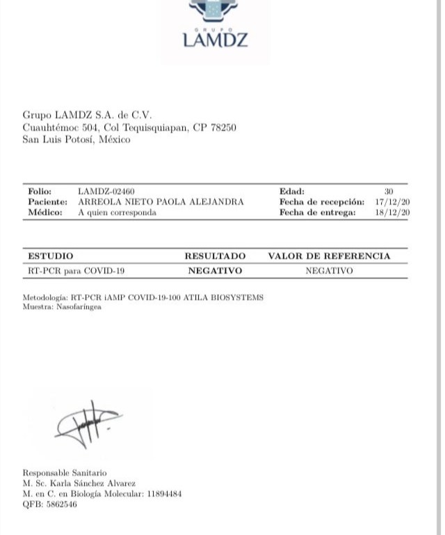 Este día, Arreola Nieto recibió los resultados de laboratorio, en los que se notifica como negativo a la enfermedad del virus SARS-COV-2.