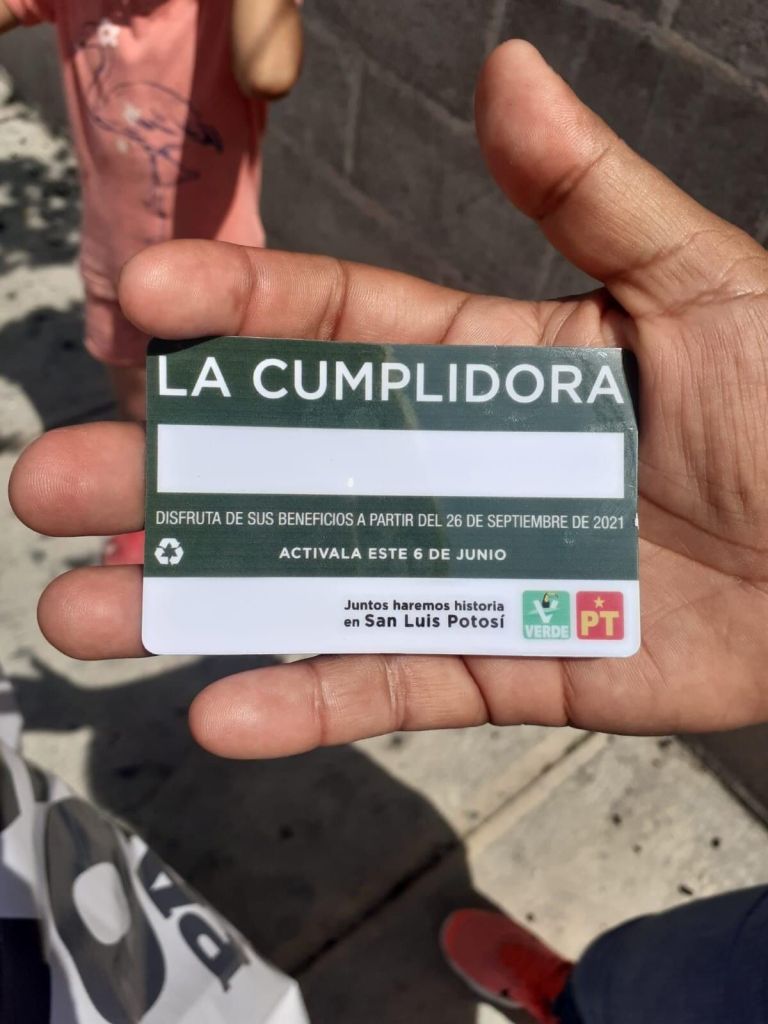 - La tarjeta esta siendo ofrecida por el partido al que pertence el candidato Ricardo Gallardo para cambiar votos por beneficios.