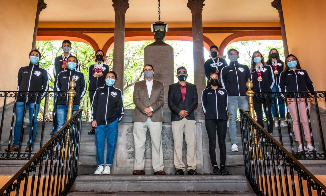 El rector de la Universidad Autónoma de San Luis Potosí, Dr. Alejandro Zermeño Guerra, recibió en el edificio central, a los jóvenes deportistas que representaron a la institución en el Campeonato Nacional Universitario de Atletismo 2021, efectuado en la Universidad Autónoma de Coahuila (UAdeC) en el marco de los Juegos Nacionales del Consejo Nacional del Deporte de la Educación A.C. (CONDDE).