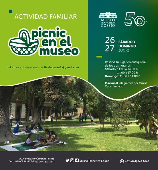A partir de junio, el último fin de semana de cada mes, el Museo Francisco Cossío llevará a cabo la actividad familiar “Picnic en el Museo”, que iniciará el 26 y 27 de junio, informó Arturo Herrera Silva, titular de la Secretaría de Cultura de San Luis Potosí.