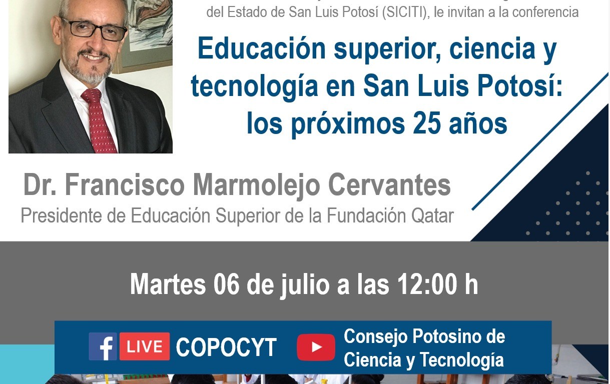 La conferencia se titula “Educación superior, ciencia y tecnología en San Luis Potosí: los próximos 25 años”, y se transmitirá a través de las páginas de Facebook y YouTube del COPOCYT en: https://www.facebook.com/copocyt/ y https://www.youtube.com/user/COPOCYT, desde donde los participantes podrán realizar preguntas.