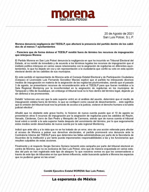 En este sentido el representante de Morena ante el Consejo Estatal Electoral y de Participación Ciudadana (Ceepac) el Licenciado Luis Fernando González Macías explicó que el partido ha interpuesto diversos medios de impugnación en materia de la asignación de las regidurías plurinominales, siendo que el pasado 3 de agosto, se presentaron recursos de reconsideración ante el TEESLP para que fueran remitidos a la Sala Regional Monterrey por la inconformidad en la asignación de regidurías en los municipios de Tampacán y Villa de Guadalupe, sin embargo el tribunal local no lo hizo dentro del término legal, dejando ya sin defensa a los promoventes.