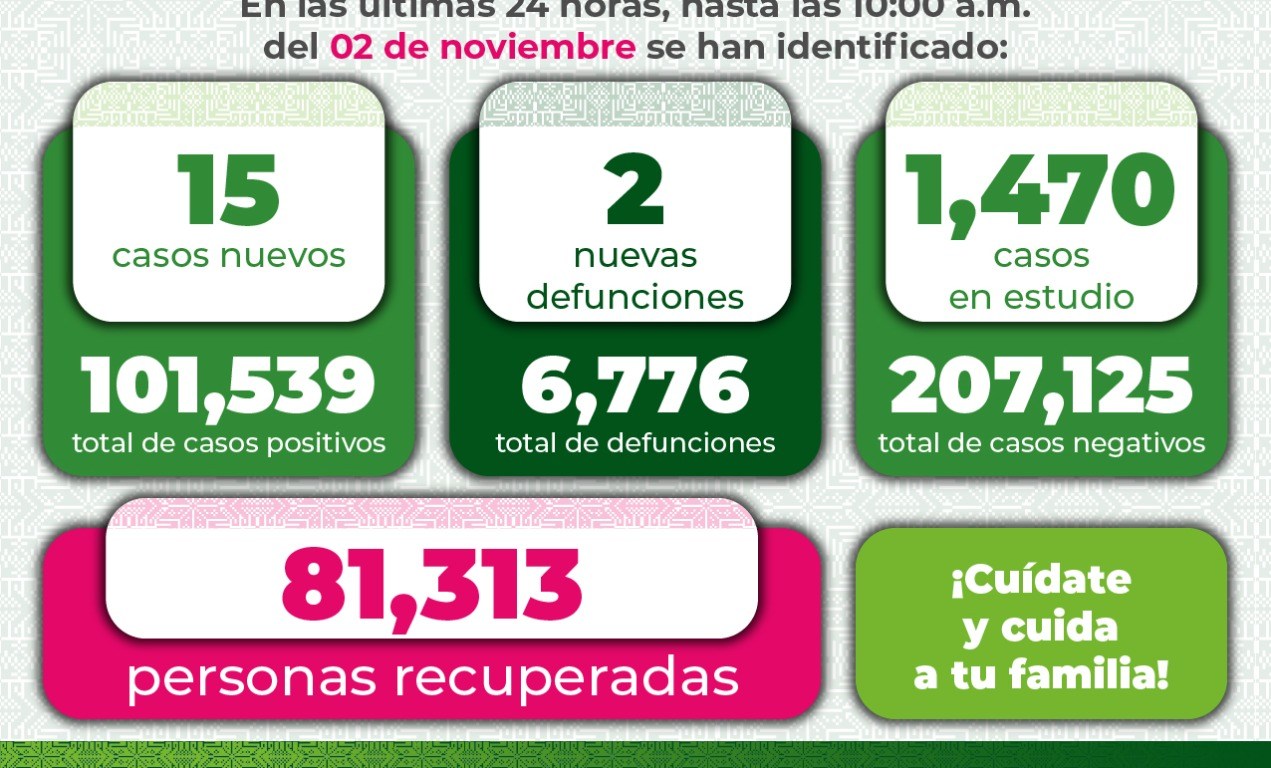 Referente al reporte diario de COVID-19 en la entidad, los Servicios de Salud y el Comité Estatal para la Seguridad en Salud, informan que hasta este miércoles 3 de noviembre, se registran 101 mil 539 casos totales de Covid-19, con la confirmación de 15 nuevos contagios de acuerdo al reporte epidemiológico de las últimas 24 horas.