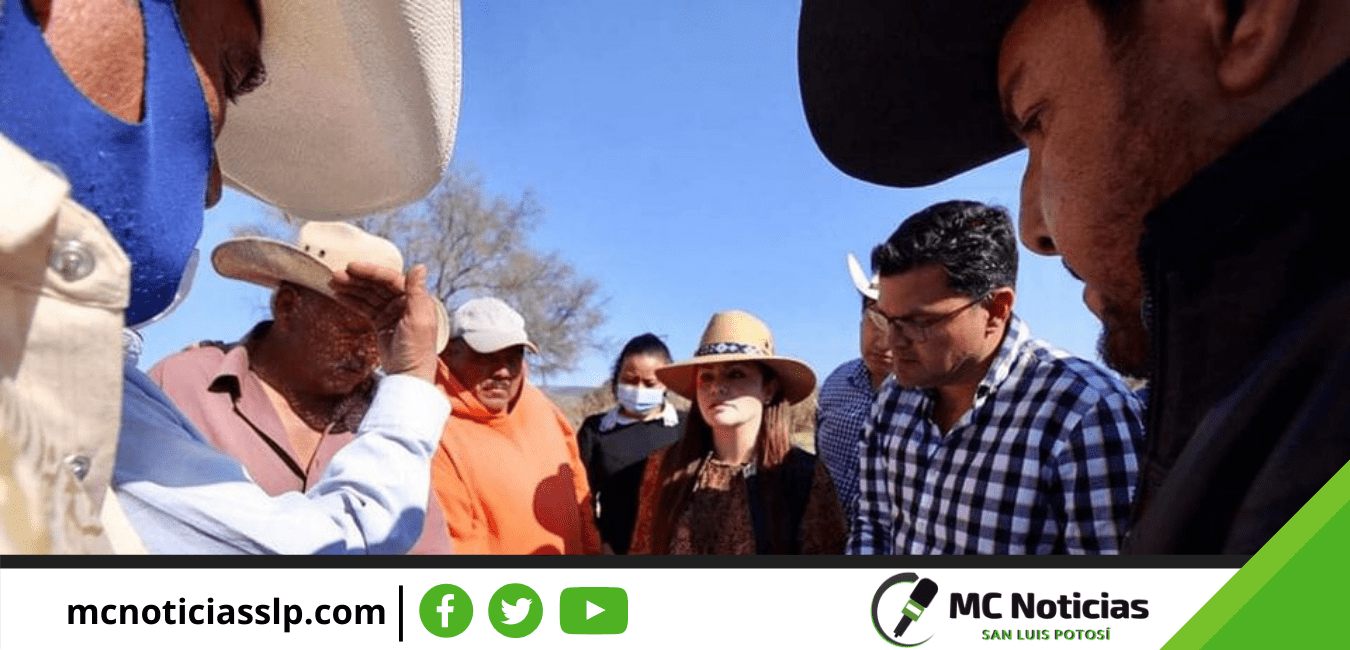 En la comunidad El Rosario, la presidenta municipal de Villa de Reyes, Érika Briones Pérez se reunió con productores agrícolas y el representante de la Secretaría de Agricultura y Desarrollo Rural (Sader), José Tonathiu Hervert Carballo, para revisar el proyecto de aprovechamiento de agua, a través de un estanque para la realización de bordo y aprovechar este recurso para el riego de sus sembradíos.