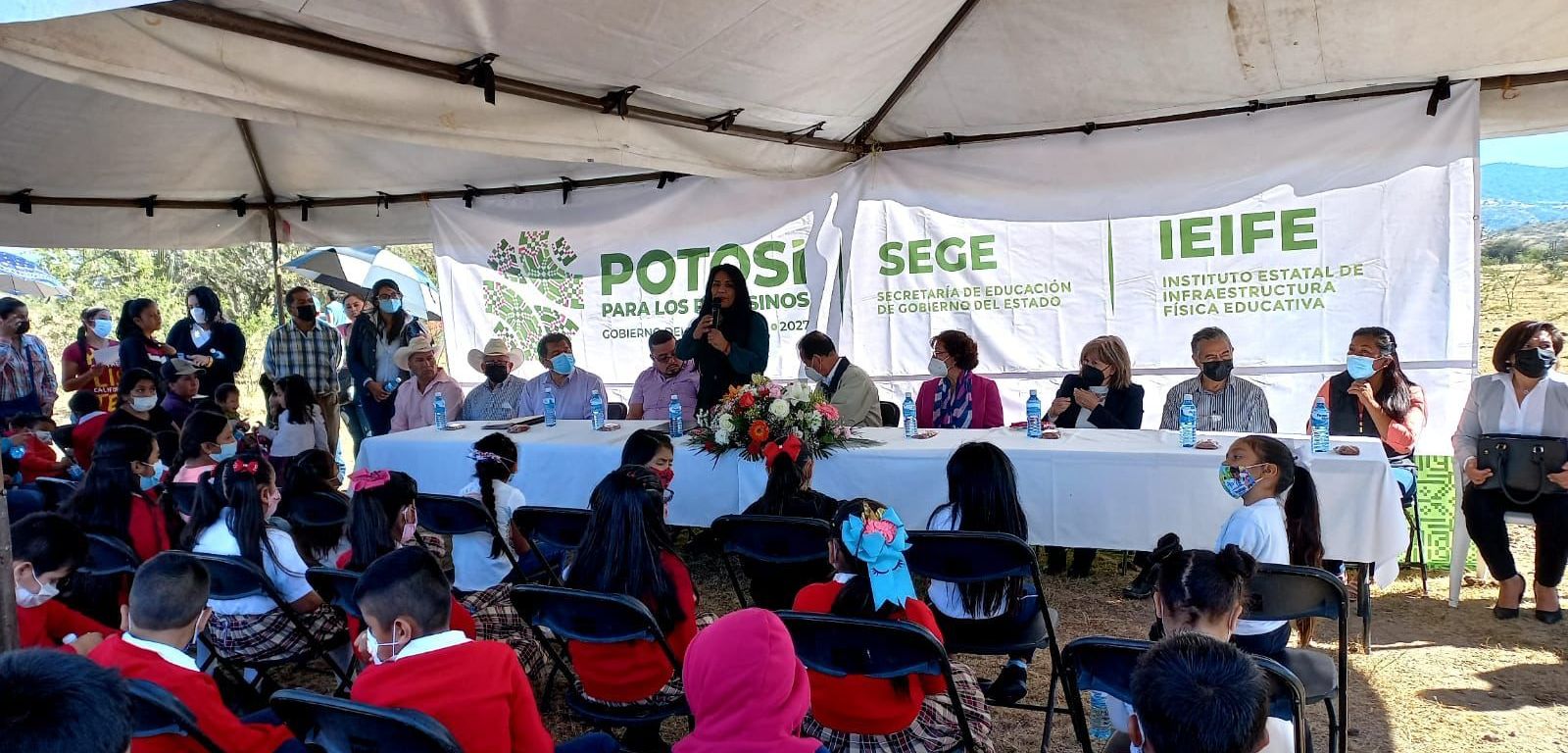 El secretario de Educación del Gobierno del Estado (SEGE) Ernesto Jesús Barajas Ábrego, con la representación del Gobernador Ricardo Gallardo Cardona, acompañado por la presidenta municipal de Ciudad del Maíz Mireya Vancini Villanueva, fue el encargado de dar el banderazo de arranque de la obra.