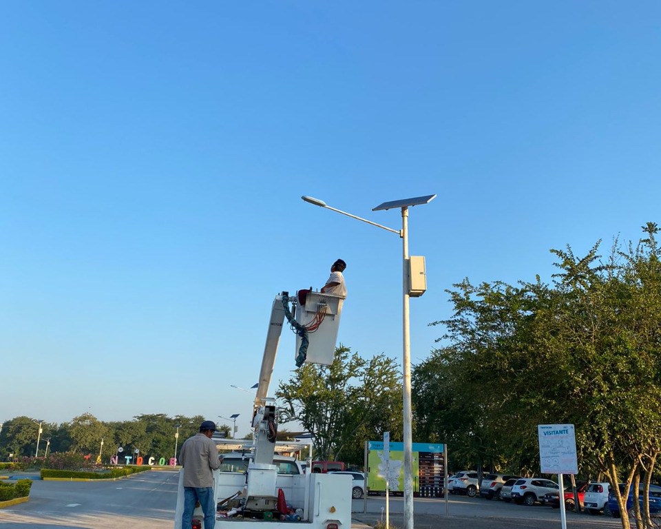 La Dirección del Parque Tantocob en coordinación con Parques y Jardines, realizan labores de mantenimiento y limpieza de paneles al alumbrado existente en el sitio.