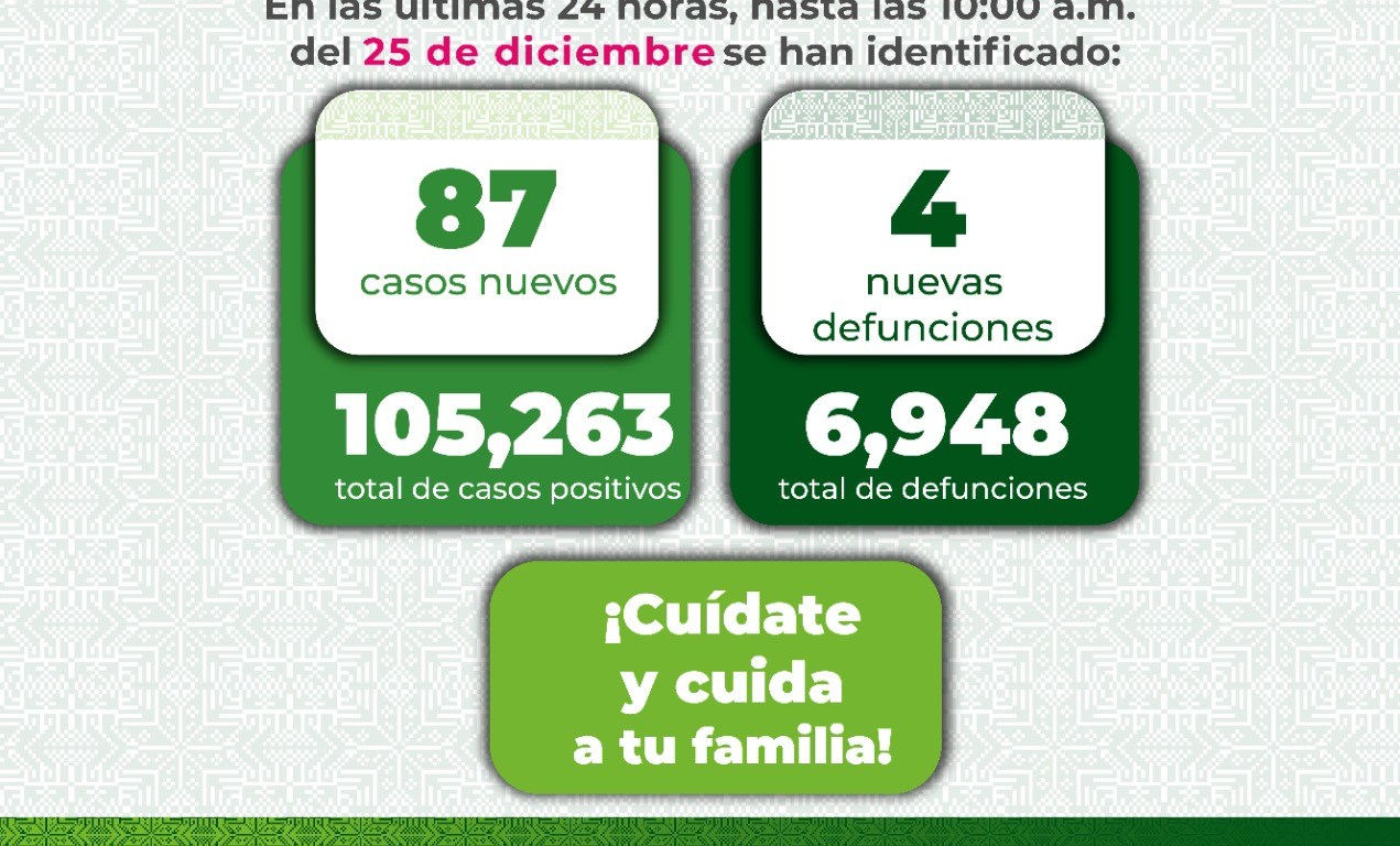 Los Servicios de Salud y el Comité Estatal para la Seguridad en Salud, informan que, hasta este sábado 25 de diciembre, se registran 105 mil 263 casos totales de Covid-19, con la confirmación de 87 nuevos contagios de acuerdo al reporte epidemiológico de las últimas 24 horas.