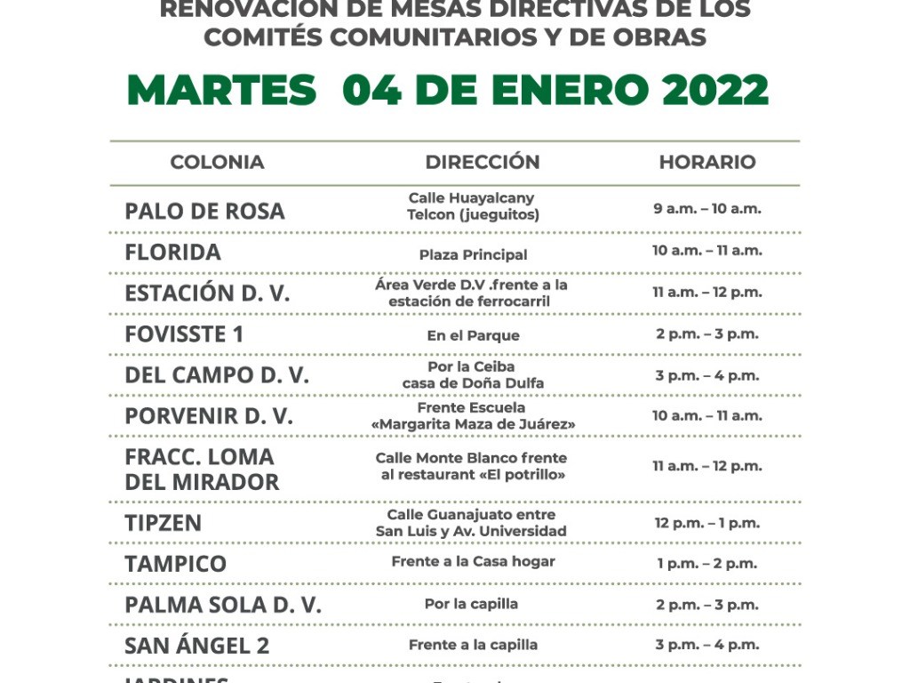 Para ello se estableció un calendario que quedo de la siguiente forma; para este martes 4 de enero las colonias que se visitarán son Palo de Rosa a las 9 am; Florida a las 10 am; Estación Derecho de Vía a las 11am; FOVISSTE 1 a las 2pm; Del Campo Derecho de Vía a las 3pm; Porvenir Derecho de Vía a las 10am; Fraccionamiento Loma del Mirador a las 11am; Tipzen a las 12pm; Tampico a la 1pm; Palma Sola Derecho de Vía a las 2pm; San Ángel 2 a las 3pm; Jardines del Campestre a las 4pm; Militar a las 5pm; Lomas Oriente a las 6pm y Margarita de Gortari a las 7pm.