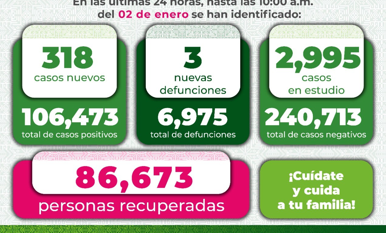 Los Servicios de Salud y el Comité Estatal para la Seguridad en Salud, informan que, hasta este domingo 2 de enero se registran 105 mil 473 casos totales de Covid-19, con la confirmación de 318 nuevos contagios de acuerdo al reporte epidemiológico de las últimas 24 horas.