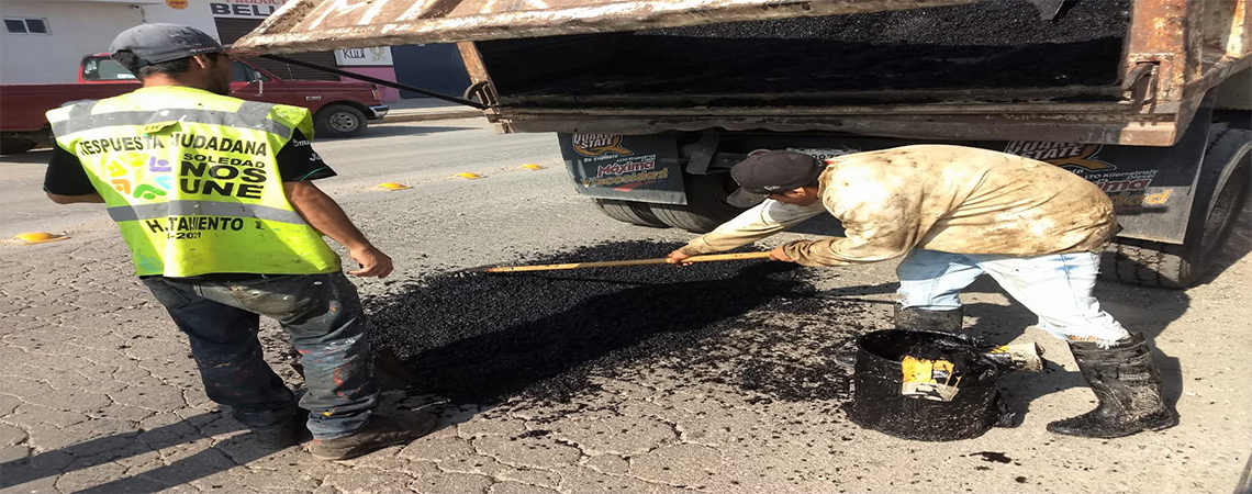 El Ayuntamiento de Soledad, a través de la dirección de Respuesta Ciudadana, implementa de manera permanente el programa de bacheo en atención a los reportes que realiza la población, lo que fortalece el mejoramiento de calles y avenidas del municipio.