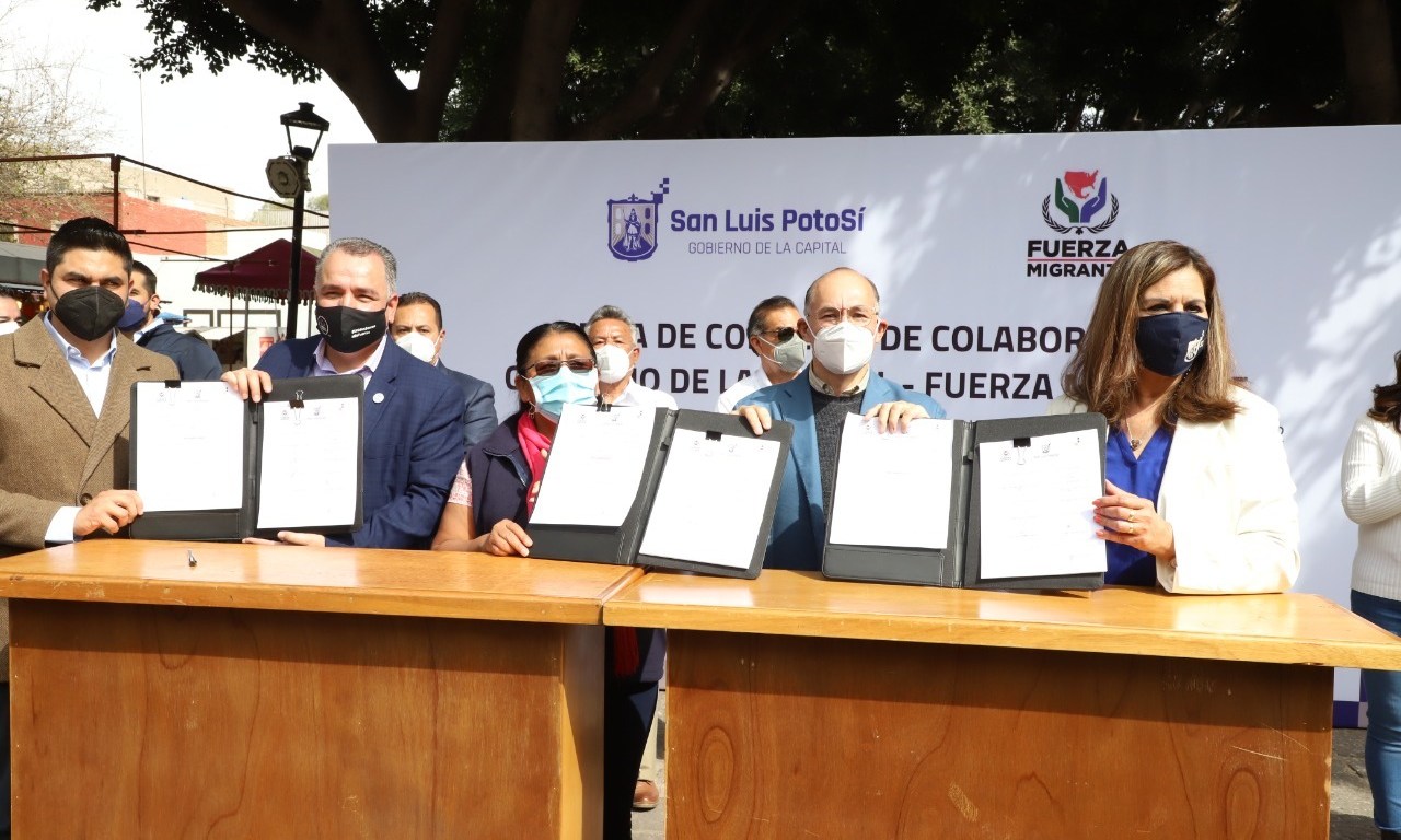 En el marco de la firma del convenio de colaboración con la organización Fuerza Migrante, el alcalde de San Luis Potosí, Enrique Galindo Ceballos, reconoció los esfuerzos de las y los migrantes y su solidaridad con San Luis Potosí, por lo que refrendó el compromiso de impulsar proyectos productivos, sobre todo, en comunidades de la zona rural, en los que por cada dólar aportado por migrantes, el Ayuntamiento contribuirá con dos dólares más para concretar estos beneficios en la capital potosina.