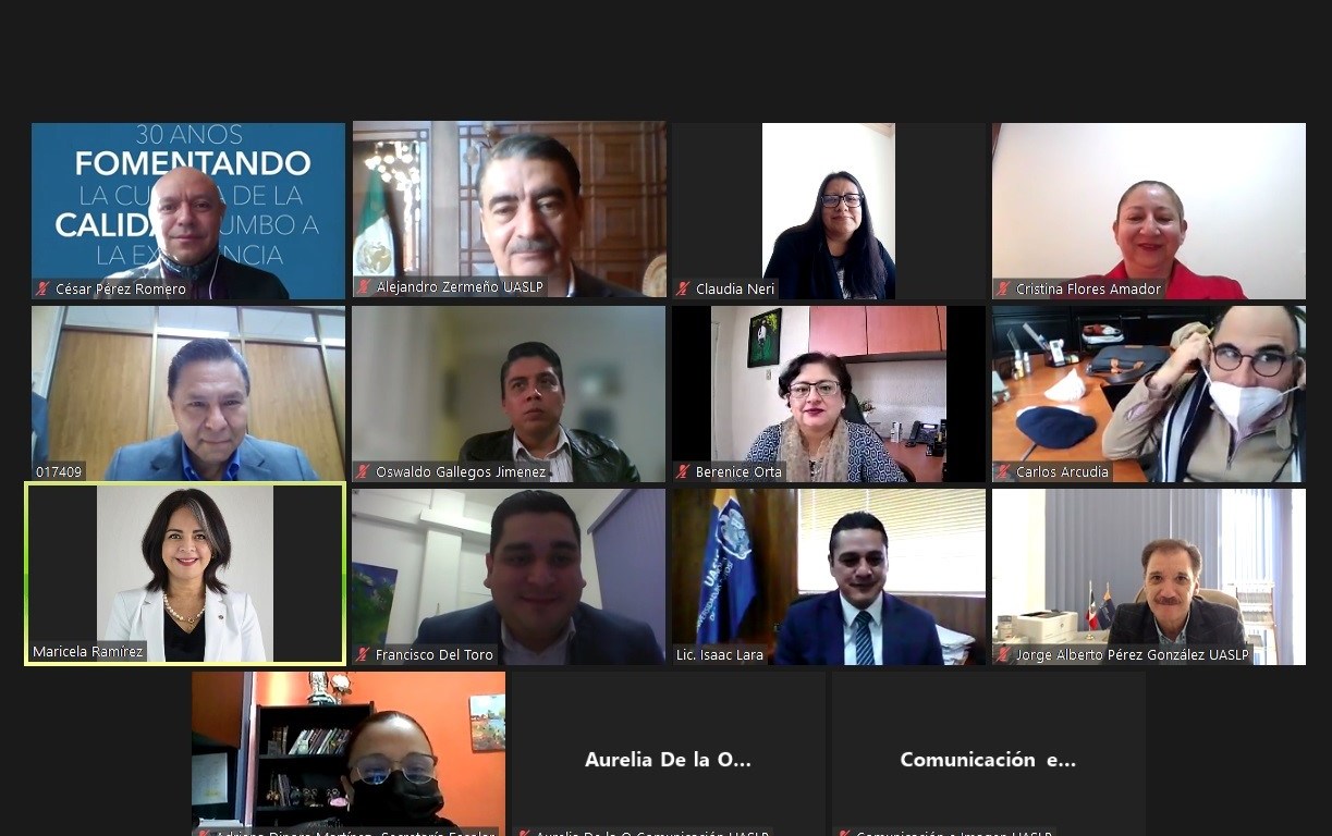 La reunión virtual de visita de evaluadores reunió al Dr. José Alberto Gaytán García, Vocal Ejecutivo del Comité de Ciencias Sociales y Administrativas, y al Lic. César Pérez Romero, Asesor institucional de CIEES, Y de la UASLP, al Dr. Jorge Alberto Pérez González, secretario Académico; la Mtra. Maricela Ramírez Zacarías, directora de Evaluación y Prospectiva de la Secretaría Académica. Y de la FEPZH, a la Dra. Sara Berenice Orta Flores, secretaría general; el Dr. Carlos Ernesto Arcudia Hernández, secretario académico; la secretaria escolar Mtra. Adriana Dinora Martínez Padrón, y el Lic. Francisco Javier del Toro, coordinador del programa de Turismo Sustentable.