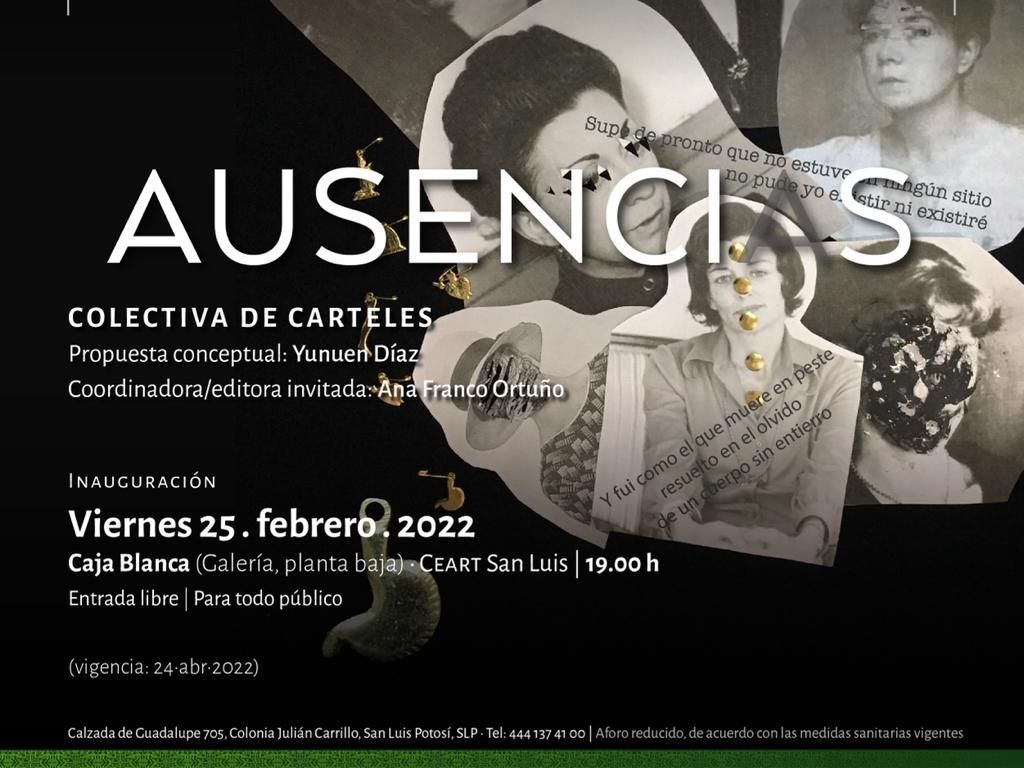 En un entorno de trabajo a favor de un desarrollo cultural incluyente, en el que se reconozca la importancia de la aportación cultural que hacen las mujeres a la sociedad, la Secretaría de Cultura (Secult) de San Luis Potosí invita al público en general a la inauguración de la exposición “Ausencias”, colectiva de carteles con la propuesta conceptual de Yunuen Díaz y la participación de un colectivo de mujeres, y Ana Franco Ortuño como editora invitada; esto en la Caja Blanca de la Galería principal del Centro de las Artes (Ceart) de San Luis Potosí, el viernes 25 de febrero en punto de las 19:00 horas con entrada libre.
