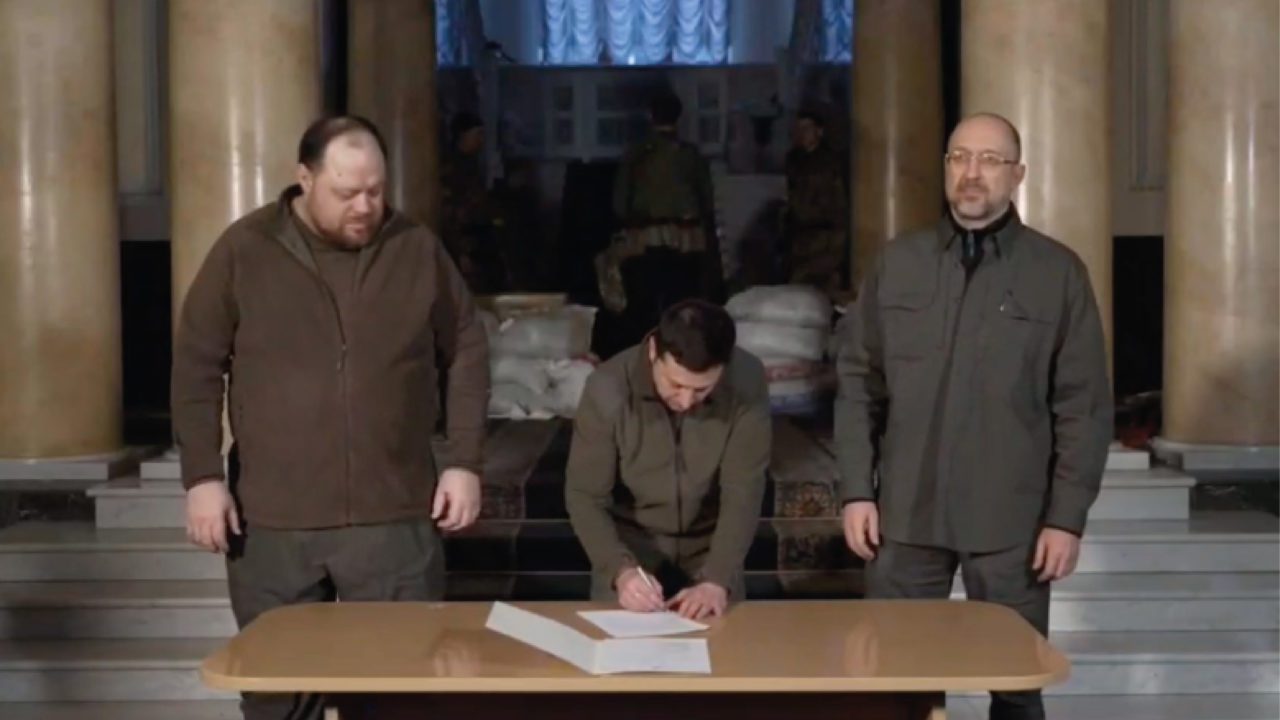 “Es un momento histórico”, dice un mensaje de la Rada Suprema (el Parlamento ucraniano) en Telegram, donde también se puede ver al mandatario ucraniano en el momento de la firma del documento.
