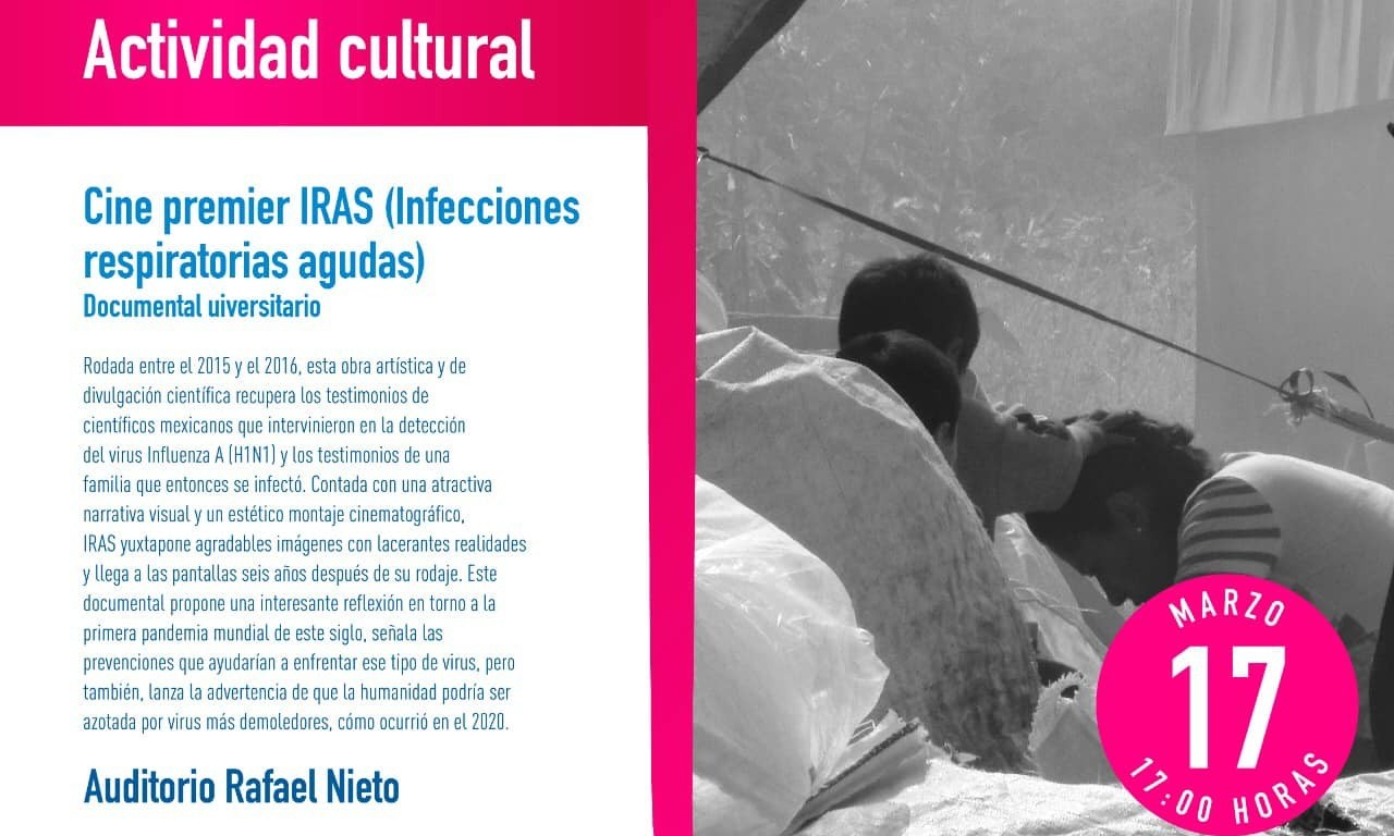 Cine premier IRAS (Infecciones respiratorias agudas), rodada entre el 2015 y 2016, es una obra artística y de divulgación científica que recupera los testimonios de investigadores mexicanos que intervinieron en la detección del virus Influenza A(H1N1) y los testimonios de una familia que se infectó.