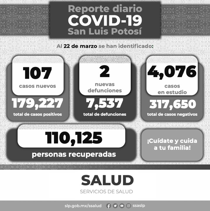 Para este martes 22 de marzo el Comité Estatal para la Seguridad en Salud y los Servicios de Salud, informan 107 nuevos casos de personas positivas a Covid-19, con lo que suman 179 mil 227 casos totales del virus en el Estado de San Luis Potosí.