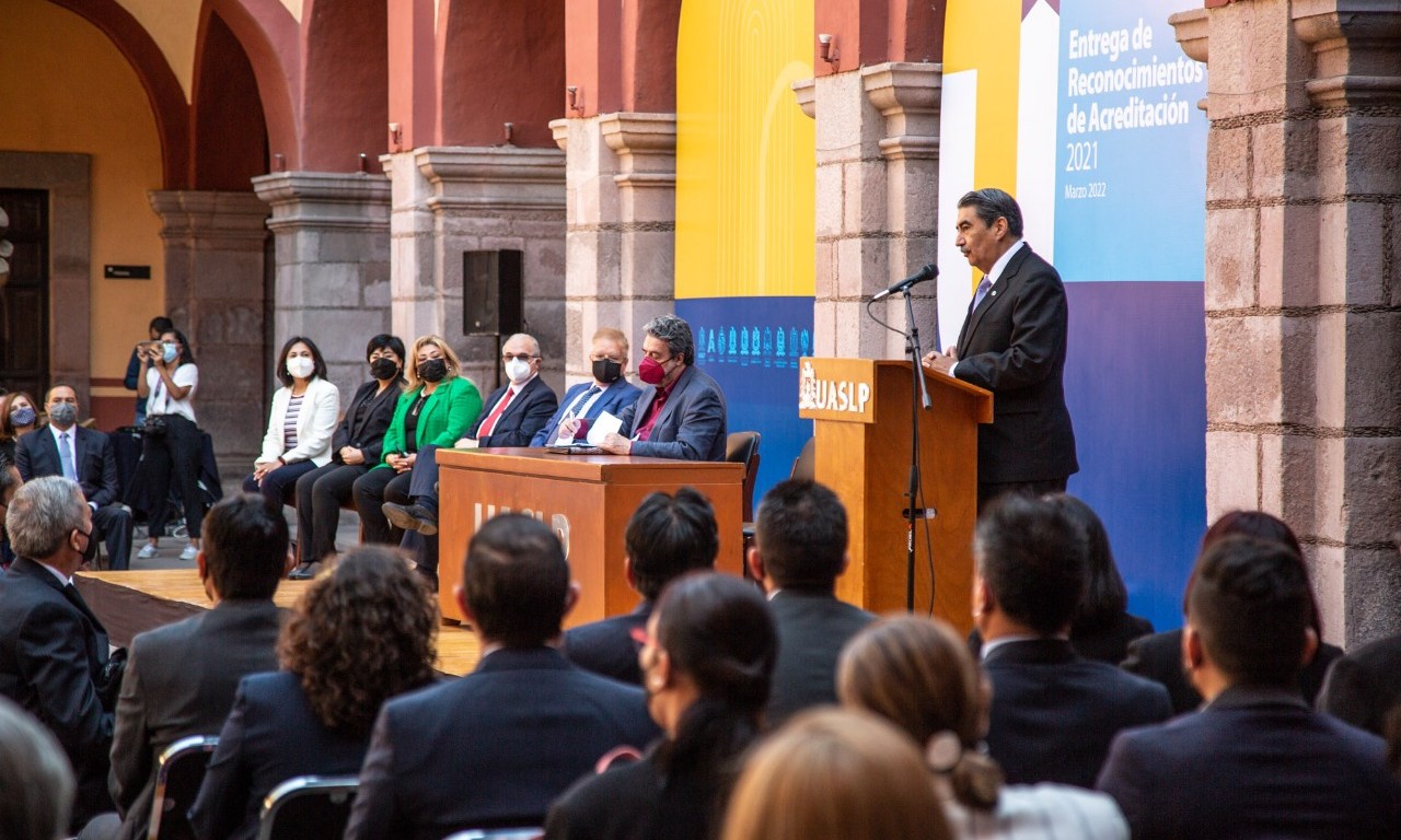 Con la presencia del doctor Francisco Luciano Concheiro Bórquez, subsecretario de Educación Superior del Gobierno de México, la Universidad Autónoma de San Luis Potosí, llevó a cabo la Ceremonia de Entrega de Reconocimientos de Acreditación 2021, en donde la Institución fue distinguida en las funciones de Administración y Gestión Institucional y Difusión, Vinculación y Extensión de la Cultura, además de que 20 programas educativos recibieron su constancia de acreditación. El evento tuvo lugar en el Patio del Edificio Central Universitario.