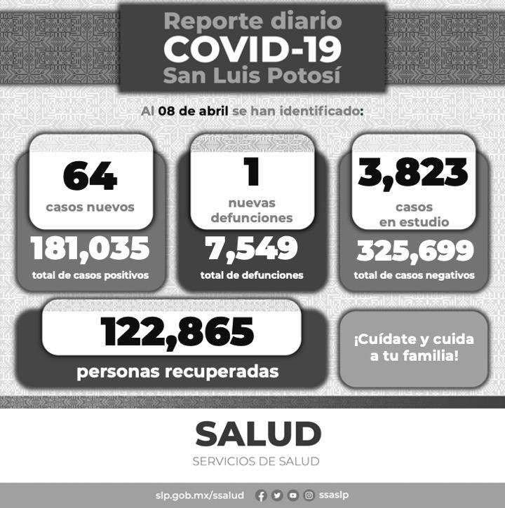 Para este 8 de abril, en cuanto al Informe Diario de casos Covid-19, el Comité Estatal para la Seguridad en Salud y los Servicios de Salud dan a conocer 64 nuevos contagios, confirmados, registrándose un 181 mil 035 casos totales de este padecimiento.