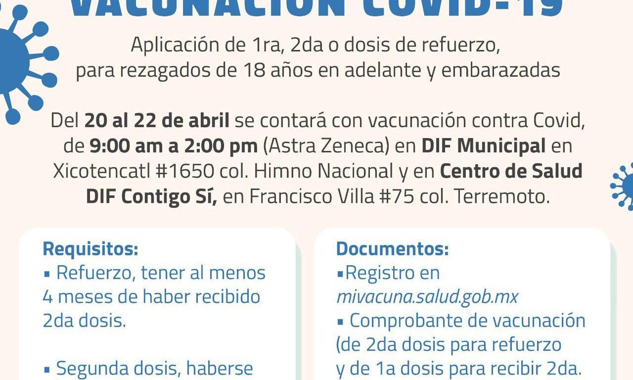 El Sistema Municipal para el Desarrollo Integral de la Familia aplicará la vacuna contra covid-19 los días miércoles 20, jueves 21 y viernes 22 de abril, en las instalaciones de los Centros de Salud “Contigo Sí”, en Xicoténcatl y en la colonia Terremoto.