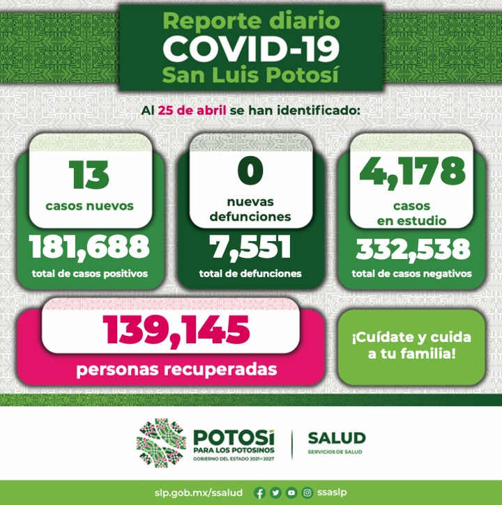 En cuanto al Informe Diario de casos Covid-19, se dan a conocer 13 nuevos contagios confirmados en la Entidad. De esta forma, el Comité Estatal para la Seguridad en Salud y los Servicios de Salud informan que, hasta este 25 de abril, se registran 181 mil 688 casos totales de este padecimiento.
