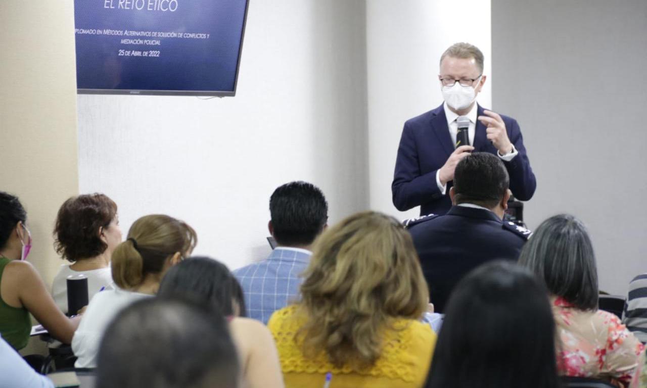SLP.- La Secretaría de Seguridad y Protección Ciudadana (SSPC) inició el Diplomado en Métodos Alternativos de Solución de Conflictos y Mediación Policial dirigido al personal de las áreas de Justicia Cívica, Trabajo Social y Dif Municipal con el objetivo de impulsar la profesionalización del personal municipal y mejorar el contacto con la ciudadanía a través de nuevos esquemas en materia de prevención y proximidad social.