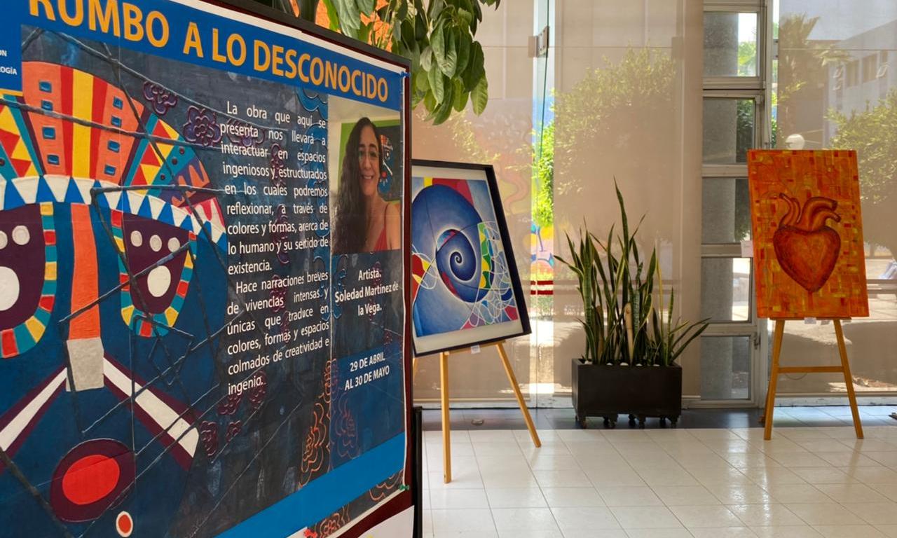 El Centro de Información en Humanidades, Bibliotecología y Psicología (CIHByP) del Sistema de Bibliotecas (Sibib) de la Universidad Autónoma de San Luis Potosí (UASLP) invitó a la comunidad universitaria y a la ciudadanía a disfrutar de la muestra pictórica “Rumbo a lo desconocido” de la artista potosina Soledad Martínez de la Vega.