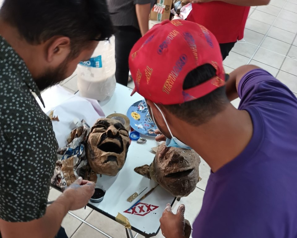 Por tal motivo se sumó a la iniciativa al artista Juan Gorupo con un taller de cartonería en donde los participantes pudieran elaborar máscaras con la técnica de papel mache, se acondicionó el área del comedor y se recibió a un total de 25 personas entre niños, jóvenes y adultos, participaron dando forma a variados rostros de cartón, que posteriormente decoraron con pintura de colores.