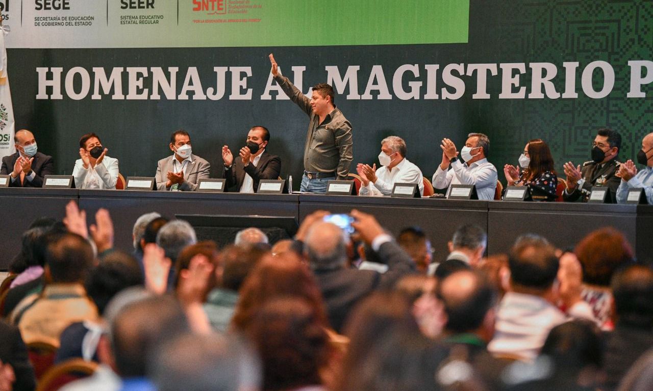 En una solemne ceremonia y acompañado de representantes de distintas organizaciones magisteriales, así como de docentes de todo el Estado, el Gobernador Ricardo Gallardo Cardona reconoció a las y los maestros, en su día, por su contribución social a una educación de calidad en la niñez y juventud, y los calificó como quienes forman a buenas y buenos ciudadanos para el futuro, además de ser protagonistas del desarrollo económico y social de San Luis Potosí.