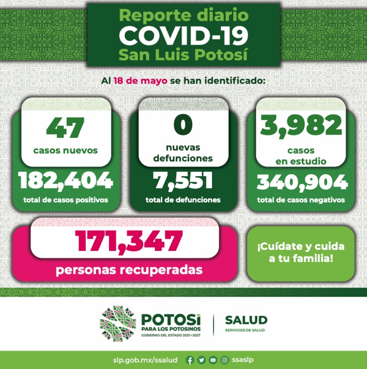En cuanto al Informe Diario de casos Covid-19, se dan a conocer 47 nuevos contagios confirmados en la Entidad. De esta forma, el Comité Estatal para la Seguridad en Salud y los Servicios de Salud informan que, hasta este 18 de mayo, se registran 182 mil 404 casos totales de este padecimiento.