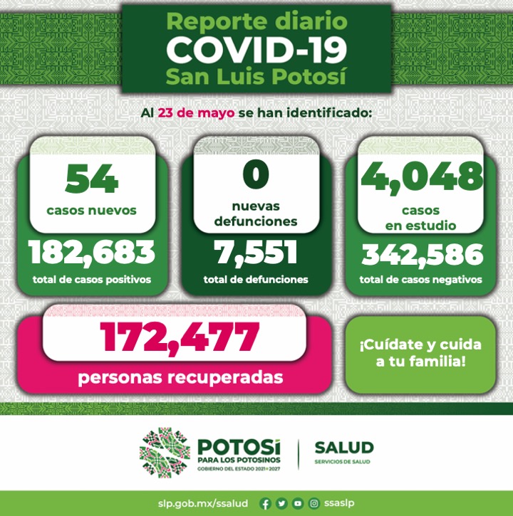 En la Jurisdicción Sanitaria I se detectaron 49 de estos nuevos contagios; dos en la Jurisdicción Sanitaria III de Villa de Pozos; tres en la Jurisdicción Sanitaria V de Ciudad Valles y ninguno en las jurisdicciones sanitarias II de Matehuala, IV de Rioverde, VI de Tamazunchale y VII de Tancanhuitz.