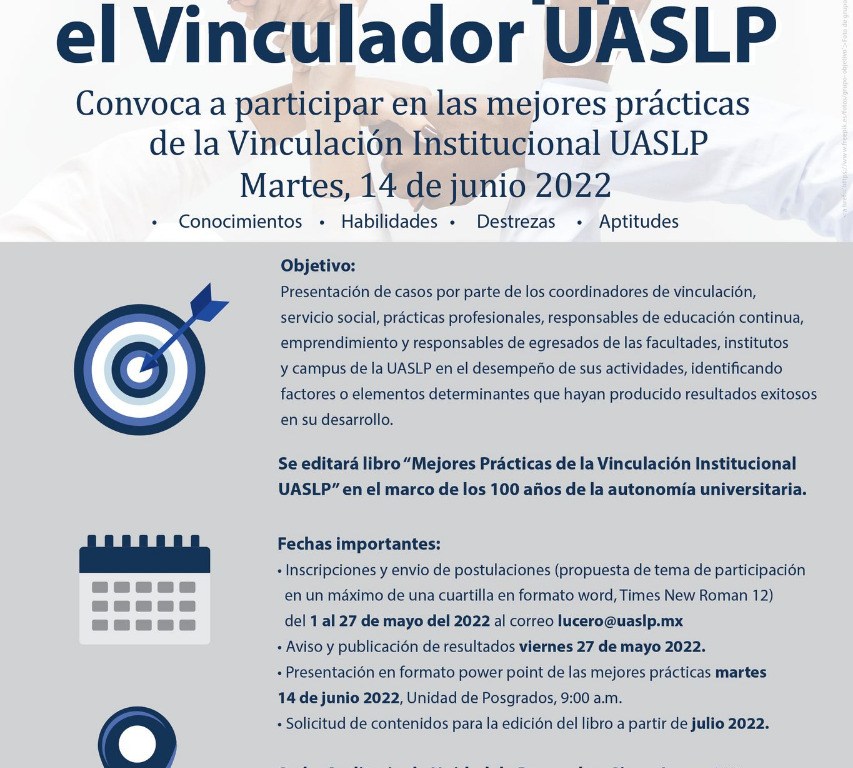 La División de Vinculación Universitaria de la Universidad Autónoma de San Luis Potosí (UASLP) convoca a la comunidad a participar en el “3er. Workshop para el Vinculador UASLP”, que realizará el martes 14 de junio en el Auditorio de la Unidad de Posgrados, con el objetivo de presentar casos del desempeño de actividades, identificando factores o elementos determinantes que hayan producido resultados exitosos en su desarrollo.