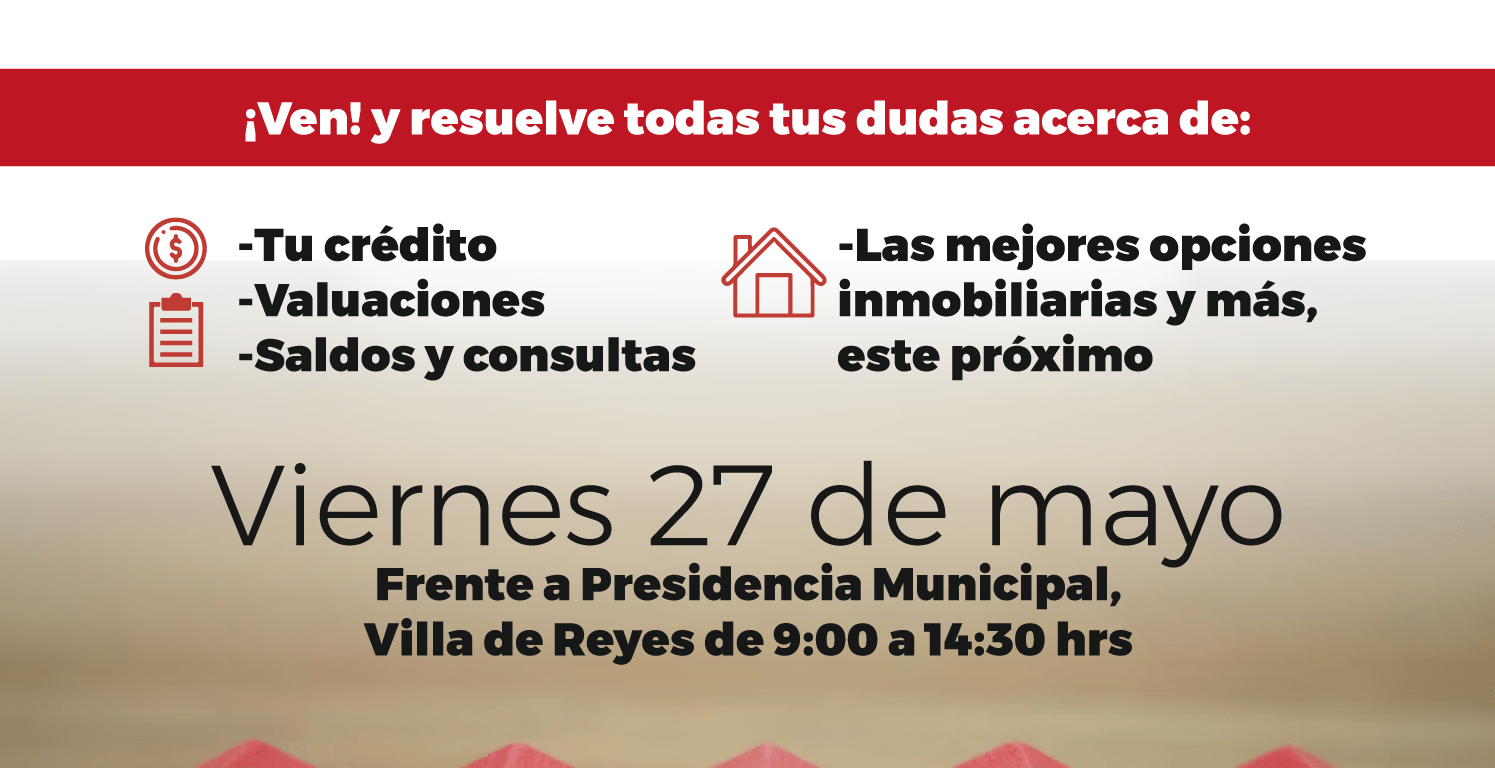 Este viernes 27 de mayo, se tendrá un módulo de atención de parte del Infonavit en Villa de Reyes, con el fin de resolver dudas de los trabajadores sobre sus aportaciones y cómo pueden ejercer su crédito para la adquisición de una vivienda o compra de terreno.