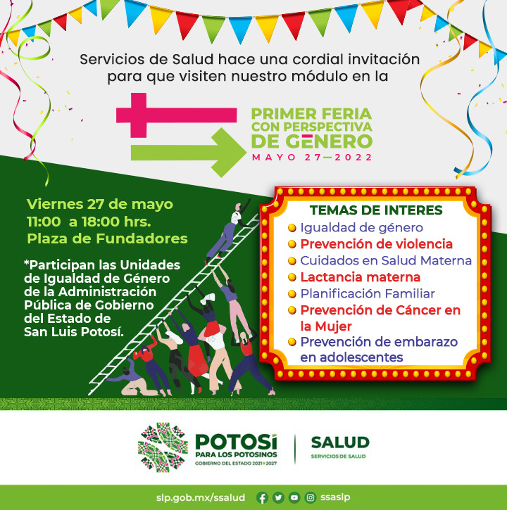 Los Servicios de Salud de San Luis Potosí les extiende la invitación para que visiten la Primera Feria con Perspectiva de Género 2022, este 27 de mayo en Plaza de Fundadores desde las 11:00 de la mañana hasta las 18:00 horas y acudan a nuestro módulo.