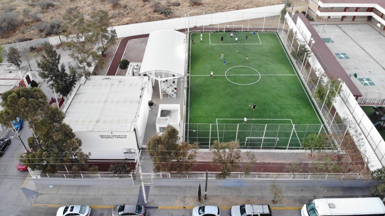 El Centro Deportivo Topacio permite la atención a más de 500 familias de la zona, posee iluminación para la actividad nocturna, así como también permite que las personas adultas mayores puedan asistir a caminar, correr o trotar.