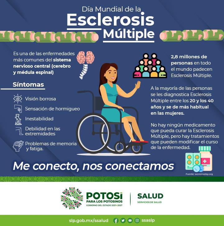 El 30 de mayo se celebra el Día Mundial de la Esclerosis Múltiple, para concienciar a la población sobre esta enfermedad que afecta a más de dos millones de personas en el mundo. En el Estado de San Luis Potosí durante el 2021, se presentaron dos casos (1 hombre y 1 mujer) con el diagnóstico de esclerosis en las unidades de los Servicios de Salud y en lo que va del presente año se ha hospitalizado a 1 masculino.