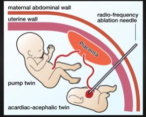 La cirugía se realizó tras el diagnóstico a uno de los gemelos como feto acardio con secuencia TRAP; el feto acardio es una condición poco frecuente en embarazos gemelares, y cuando ocurre, el gemelo es acéfalo y puede presentar además, ausencia de extremidades superiores y la secuencia síndrome de perfusión arterial reversa (TRAP, por sus siglas en inglés), es una patología asociada a complicaciones del embarazo gemelar que muestra discordancia del volumen de líquido amniótico entre los fetos y su coexistencia.