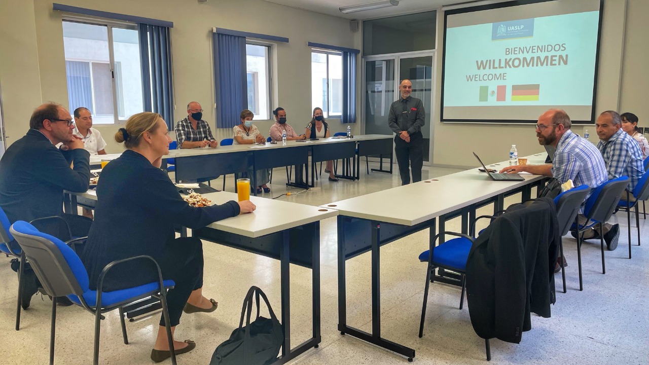 En un primer momento, sostuvieron una reunión con autoridades, donde el Mtro. Gylmar Mariel Cárdenas, jefe de la División de Vinculación, la Mtra. Idalia Acosta Castillo, directora de Internacionalización, así como el Dr. Alexander Betancourt Mendieta y el Dr. Héctor Flores Reyes de la Secretaría de Investigación y Posgrado, hicieron una presentación de la UASLP y de la ya larga tradición de la cooperación con Alemania.